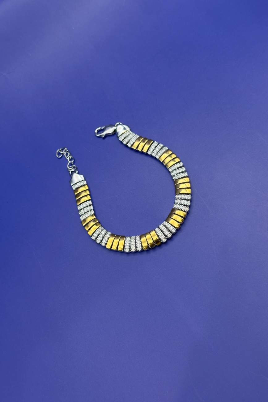 Premium men’s bracelet crafted in 925 sterling silver featuring alternating gold-finish strips and fine stone-studded segments. Sleek and modern design with a luxurious appeal, perfect for daily wear, parties & gifting. Skin-friendly, durable and fitted with a secure locking system for comfortable use.